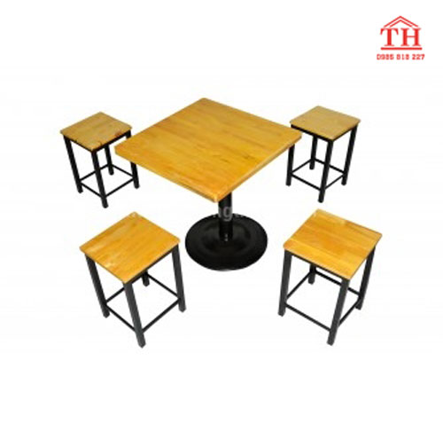 Bộ bàn ghế quán ăn nhanh pallet đôn trụ. Bàn có một chân trụ chắc chắn cùng với 4 ghế thấp. Mẫu bàn thường được sử dụng tại các quán ăn nhanh trong nhà và vỉa hè. Kích thước: Ghế 30x30x46 (cm), bàn 60x60x70 (cm). Chất liệu khung sắt sơn tĩnh điện đen và bàn gỗ thông chắc chắn. Giá bộ bàn ghế: 1,050,000 đ.